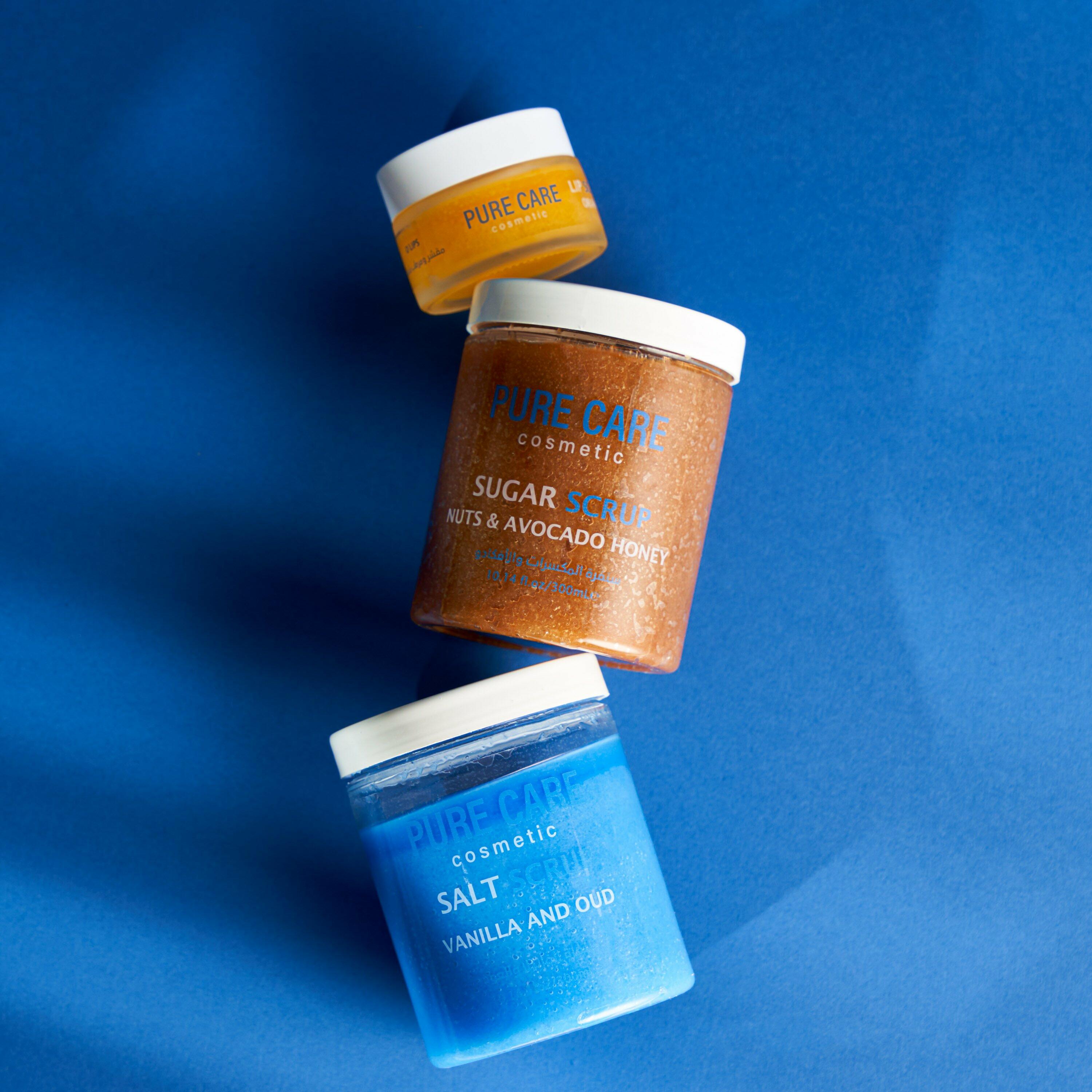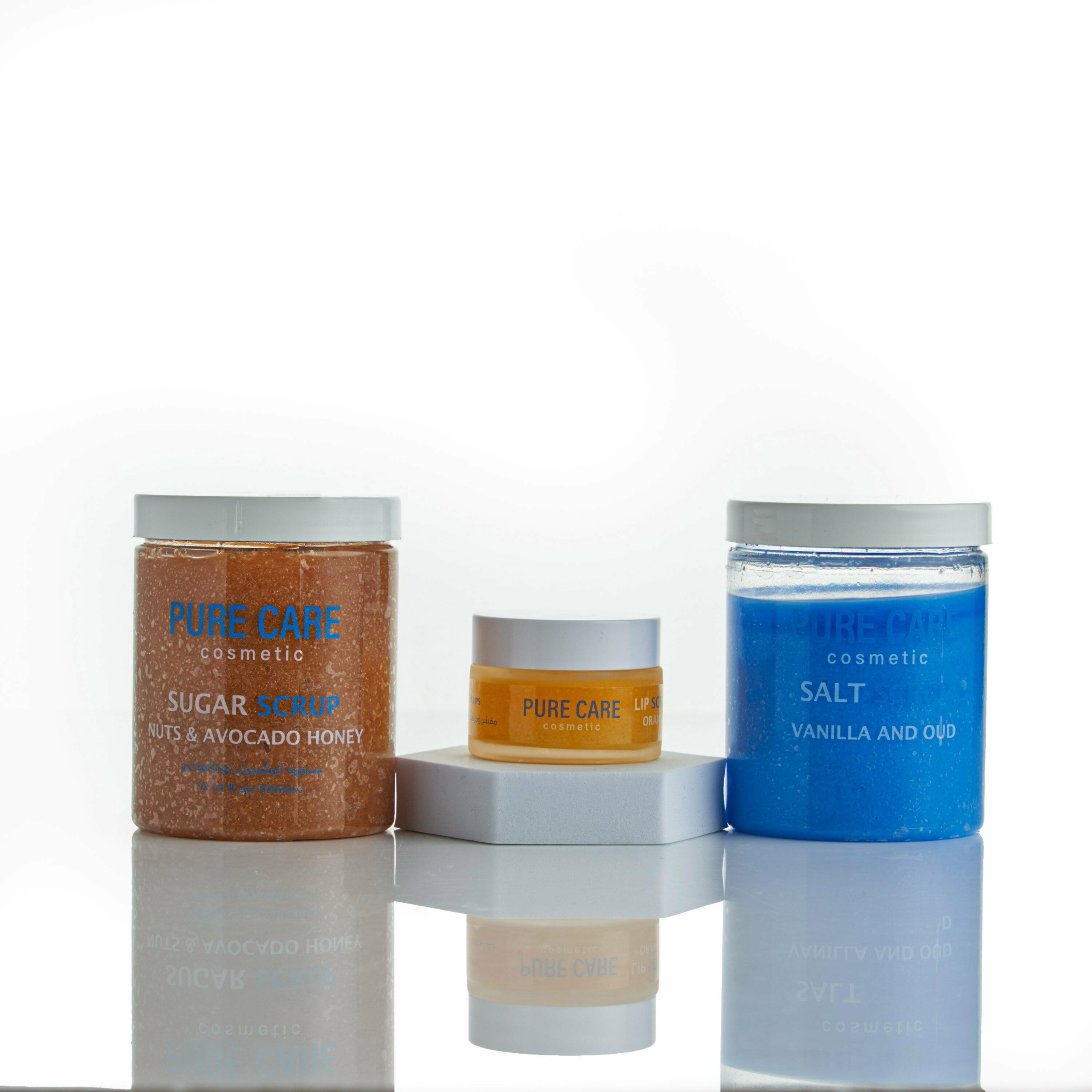 HomeScrub setScrub setDescriptionOrange lip scrub, avocado sugar and nut scrub for the face and body, and vanilla and oud scrub for the body.